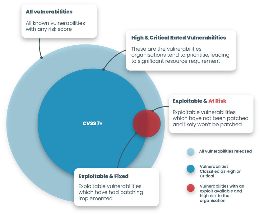 Many security teams currently aim to fix all vulnerabilities with a CVSS score of 7 or higher. In 2022, this would have meant patching 14,447 new vulnerabilities. That’s just under 40 a day, even if your Security and IT operations worked 7 days a week. An impossible task, but also an approach that lacks context. In reality, only the vulnerabilities falling under the red circle above require attention as these are the gaps in your network which will lead to a breach and are currently being attacked by hackers.