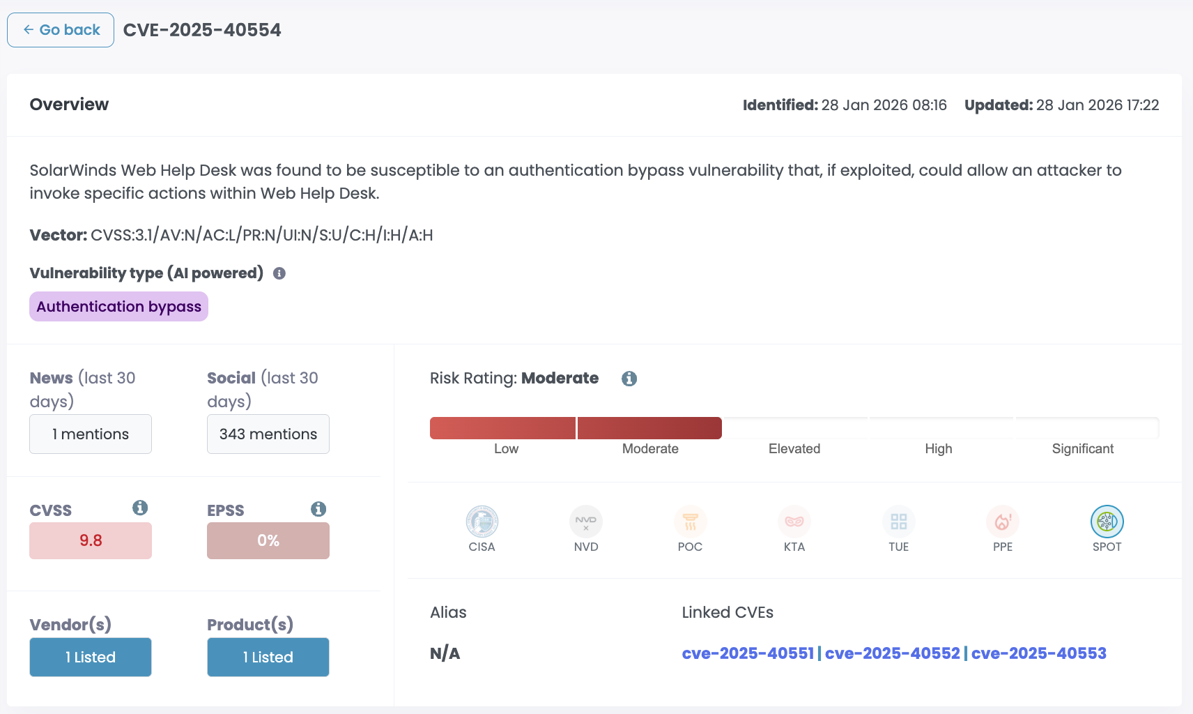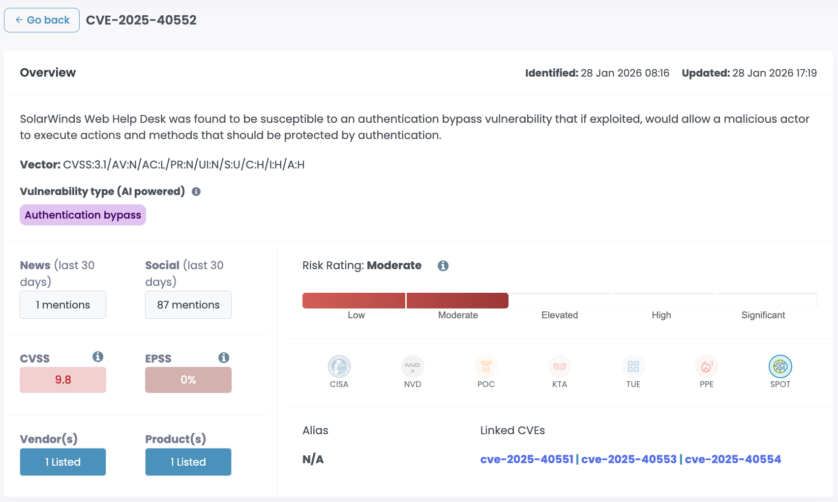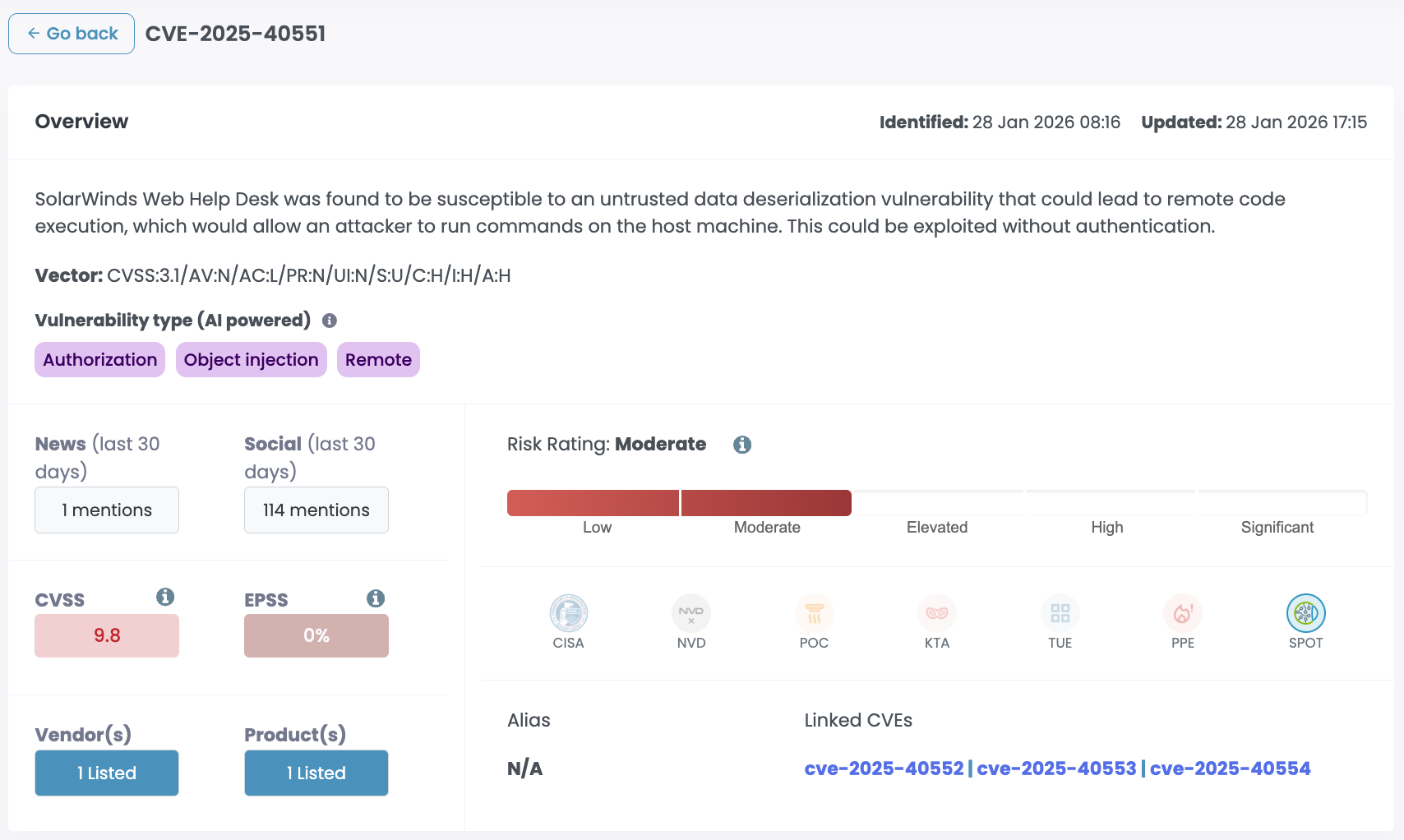 CISA added CVE-2025-40551 to its Known Exploited Vulnerabilities catalog on February 3rd, 2026. Federal agencies have been given three days to patch. CISA hasn't shared details on the specific threat activity, and the ransomware exploitation status is listed as unknown. SolarWinds still hasn't published IOCs, but the fact that it's now in KEV means this is no longer theoretical.