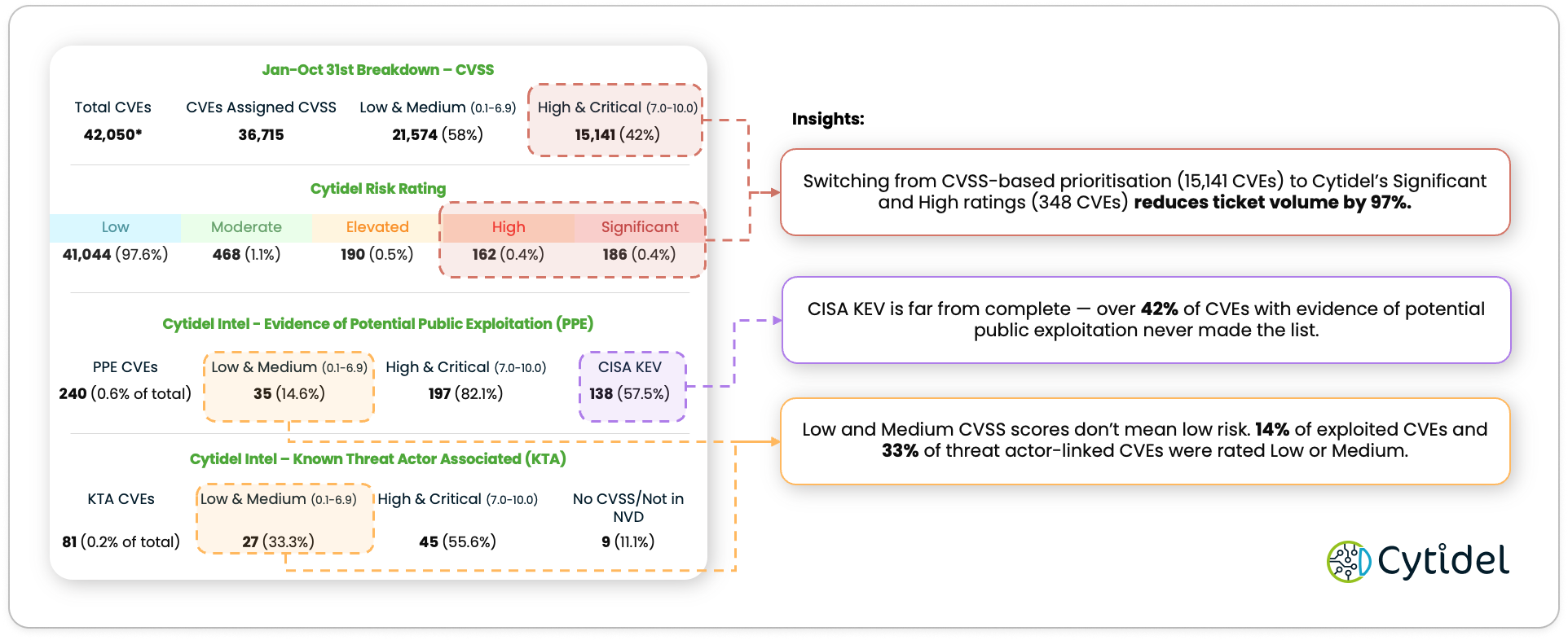 That’s the approach Cytidel enables. Providing customers with an advanced threat intelligence capability that delivers continuous, risk-driven analysis on every CVE, pinpointing the critical 1% that matter right now.